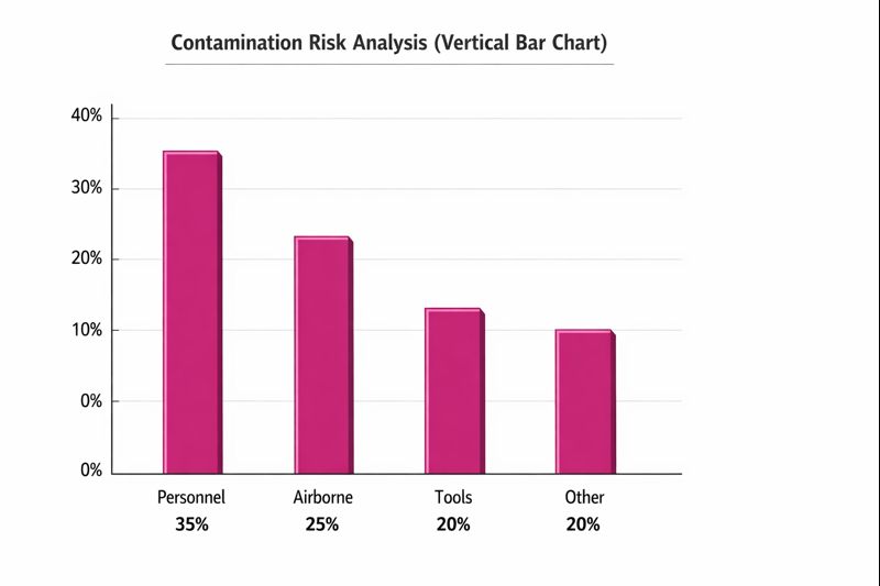 Det vertikale søylediagrammet viser at personellbevegelser bidrar mest til krysskontaminering i renrom, og legger vekt på riktig kappe og håndtering av tørketrommel.