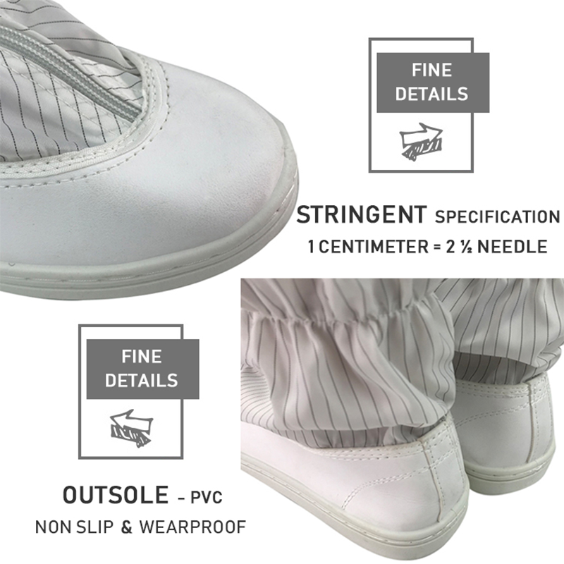 Antistatiske støvler fra Cleanroom bruker antistatiske materialer med høy ytelse for effektivt å undertrykke akkumulering av statisk elektrisitet og forhindre potensiell skade av statisk elektrisitet til sensitivt utstyr og materialer. Det er spesielt egnet for rene rom og elektroniske produksjonsmiljøer som krever streng statisk kontroll for å sikre sikkerhet og stabilitet for operatører og produksjonsmiljøer.