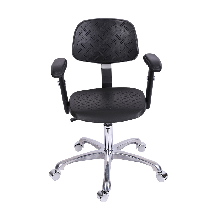Den antistatiske stolen bruker ESD-seteputer, ryggstøtte og metalltilbehør, som effektivt kan frigjøre statisk elektrisitet til bakken, gi pålitelig ESD-elektrostatisk utladningsytelse og sikre sikker bruk i elektrostatisk sensitive områder.
