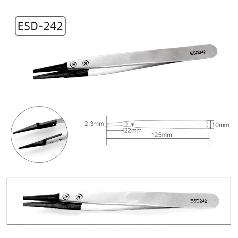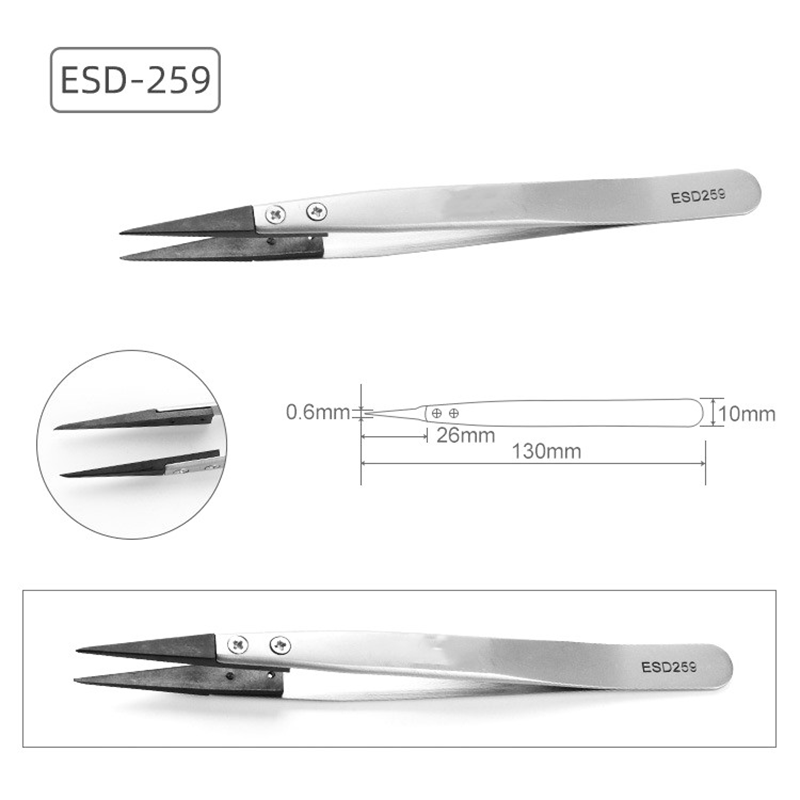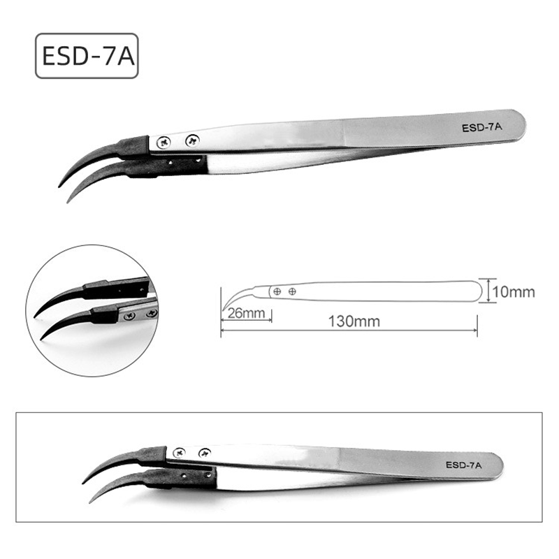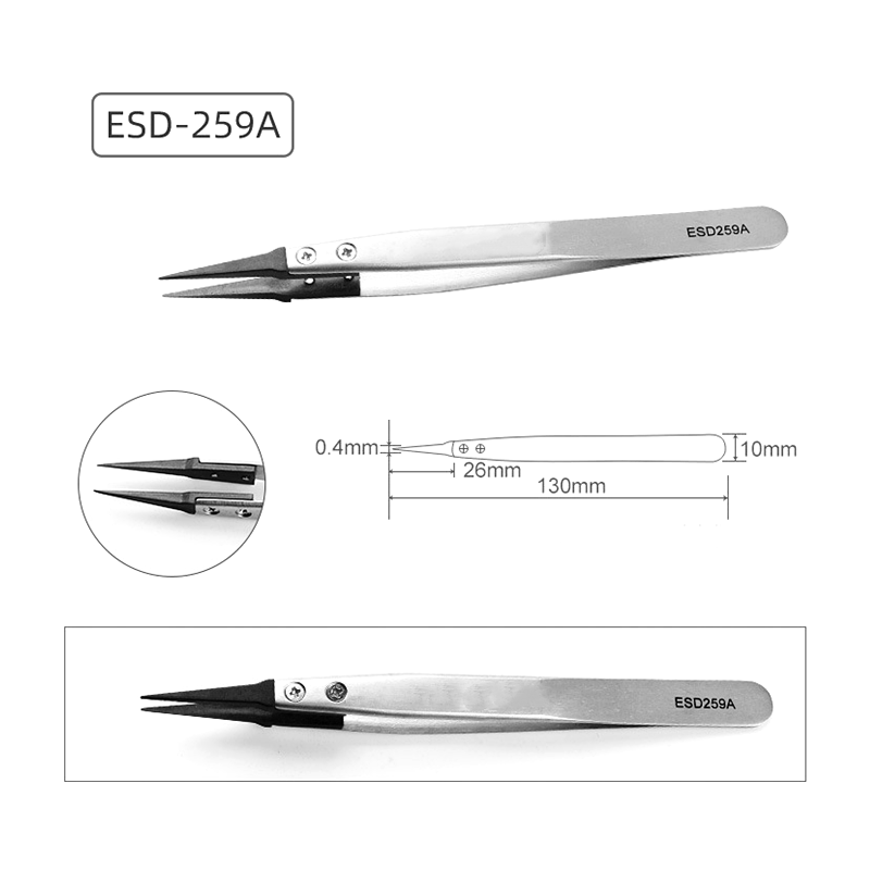 Tweezershodet er laget av en blanding av karbonfiber og spesiell plast, som effektivt kan forhindre statisk akkumulering av elektrisitet og gi et trygt driftsmiljø for statiske sensitive komponenter.